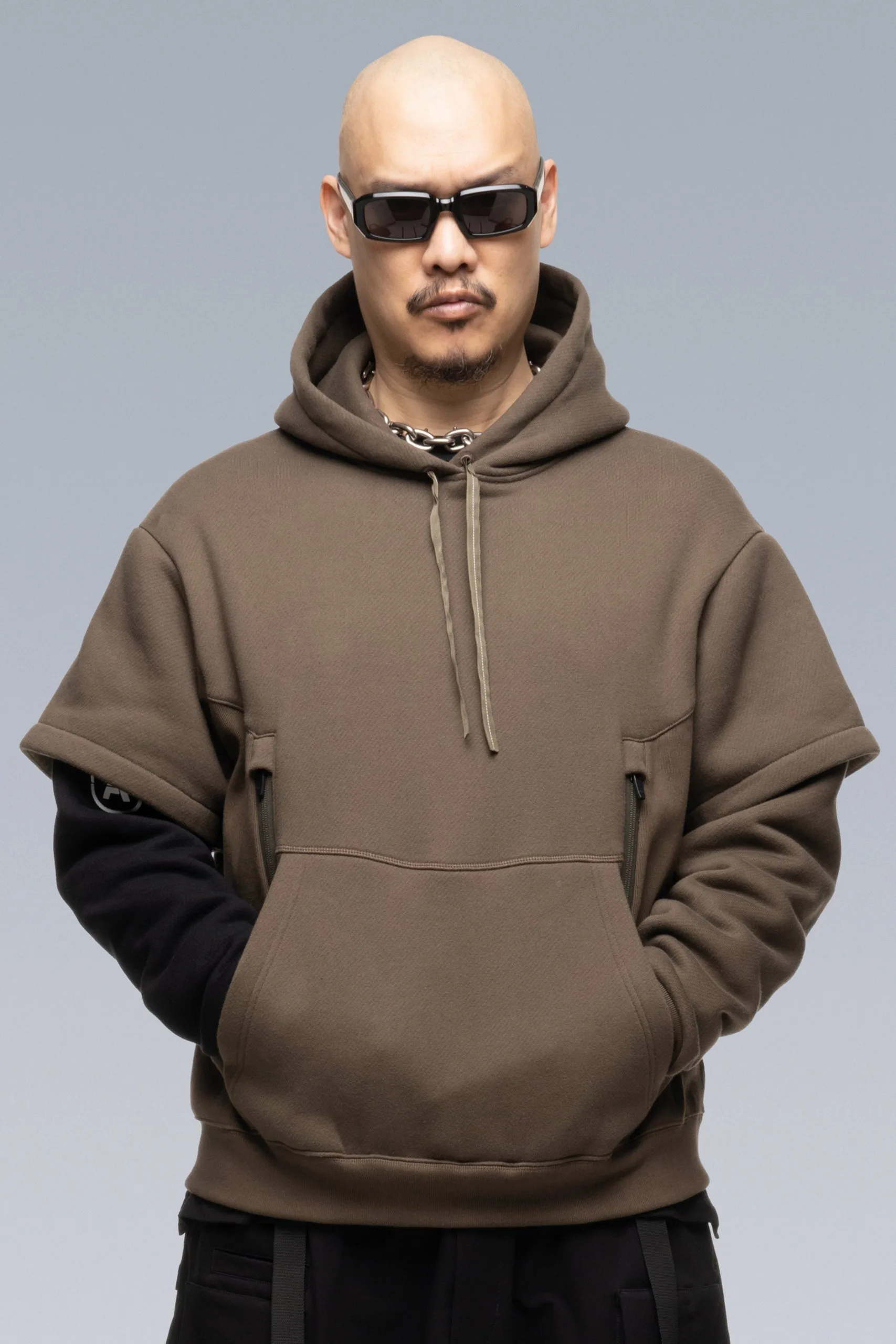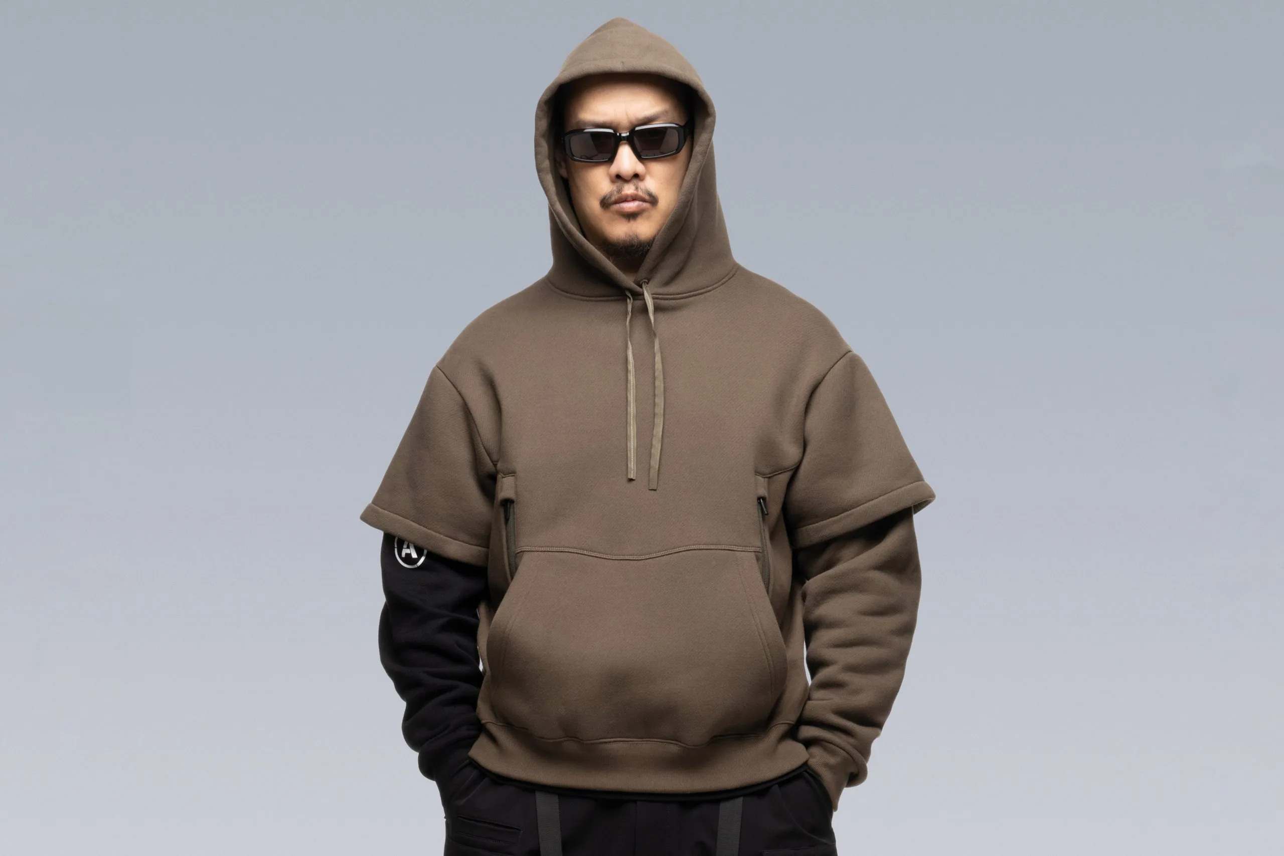 Custom fit cotton hooded sweatshirt with doubled sleeves and a partially hidden right sleeve print. Classic kangaroo pocket joined by dual holster position security pockets with size reverse coild zip closures. Standard hoody drawstrings have been replaced with the proven rapid adjust tape (two layers of tape stitched together to form an ‘x’ cross section, allowing the tape to ‘lock-in’ when knotted, yet also remain easy to untie.
