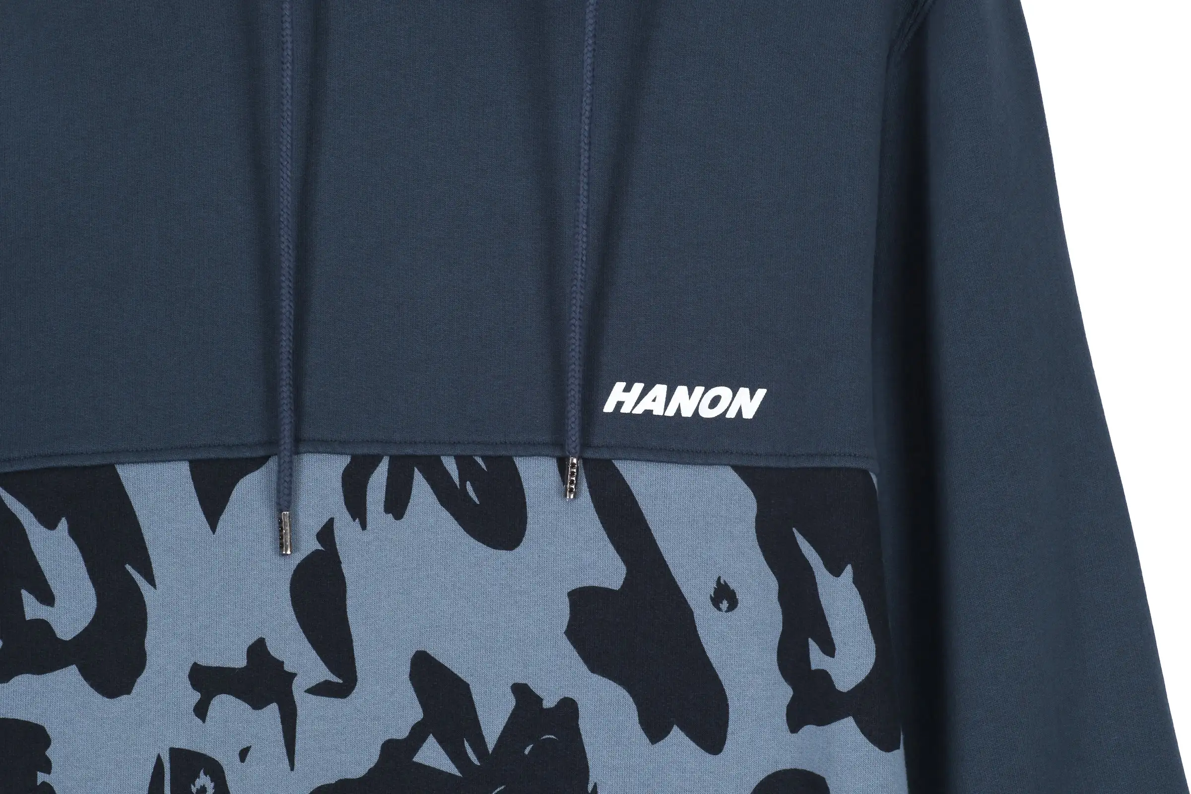 For Autumn/Winter ’18 our HANON collection returns, comprised of staples such as the Flame Badge series across t-shirts, sweats and hoods. Our Woven Shirt program also makes a welcome return with a distinctly autumnal palette, as well as a new range of graphics offered on a fresh selection of colours for the season. Here we have the Camo print hooded sweatshirt finished in Raf Blue complete with woven HANON tab on the bottom right side.