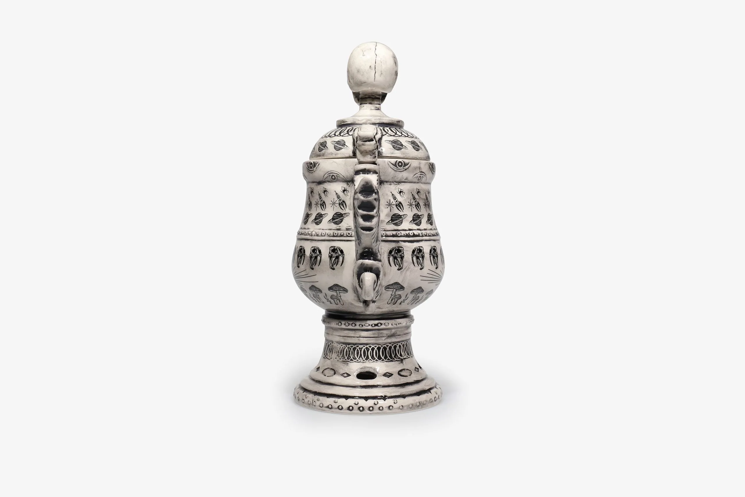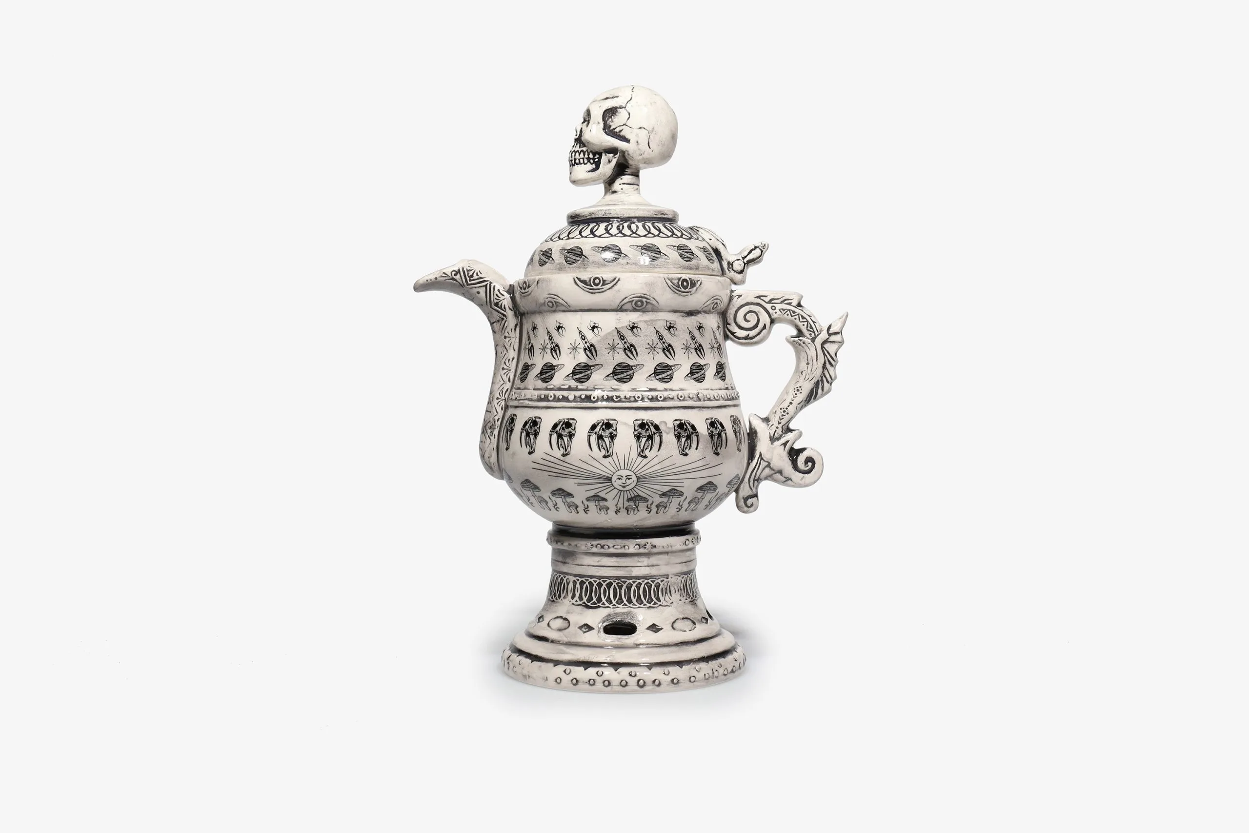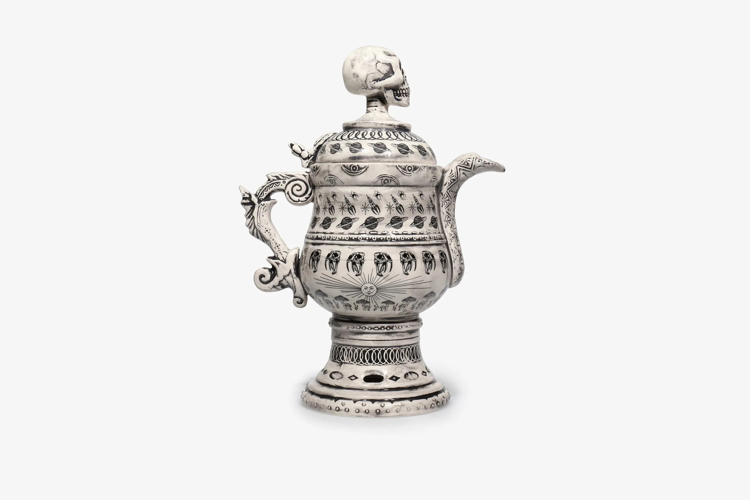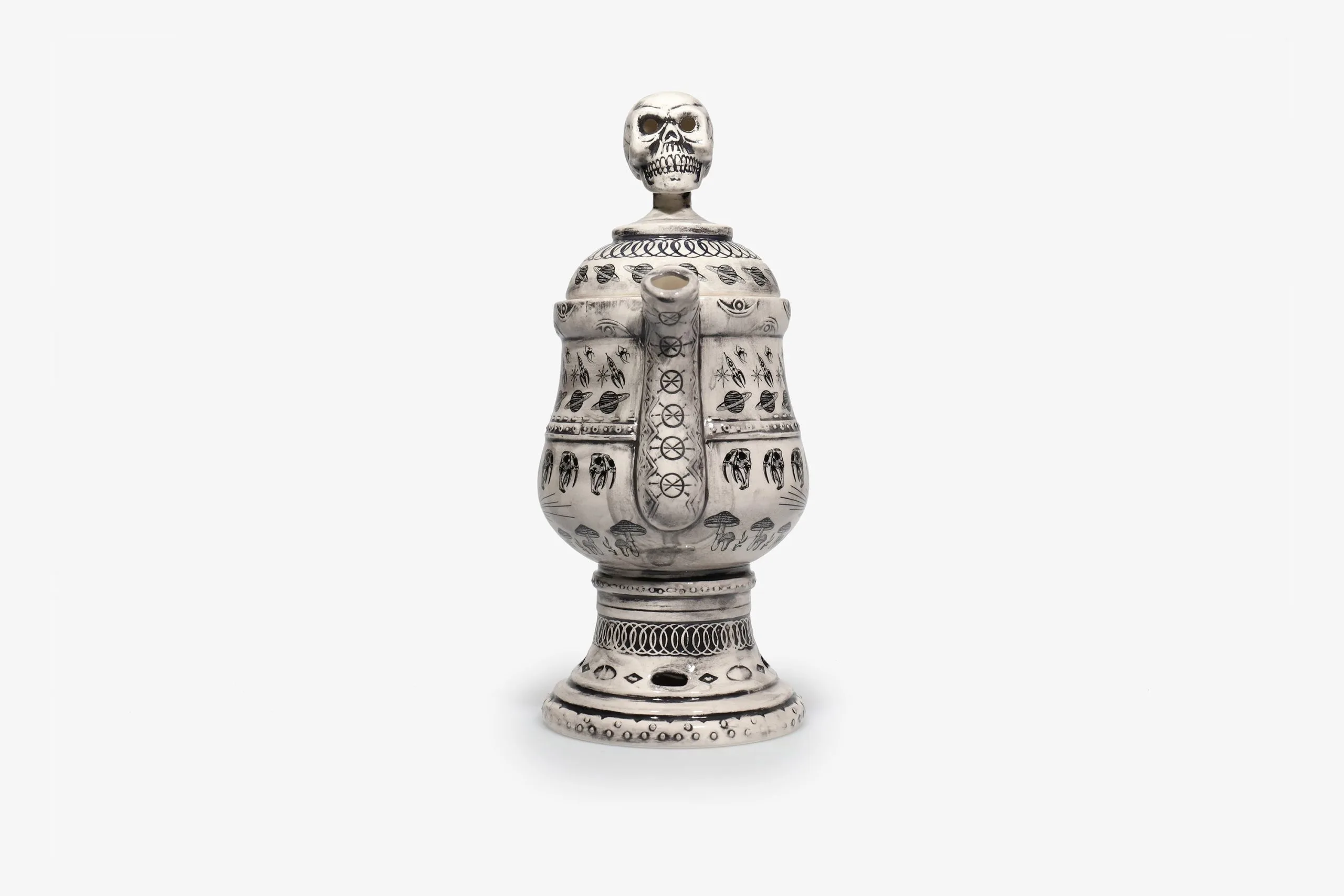 World famous for his intricate Tattoo designs, Dr. Woo collaborates with Neighborhood applying his artwork to a range of garments and homeware. This incense chamber is as intricate as it gets with the ceramic outer covered head to toe in Dr. Woo’s fine line deigns.