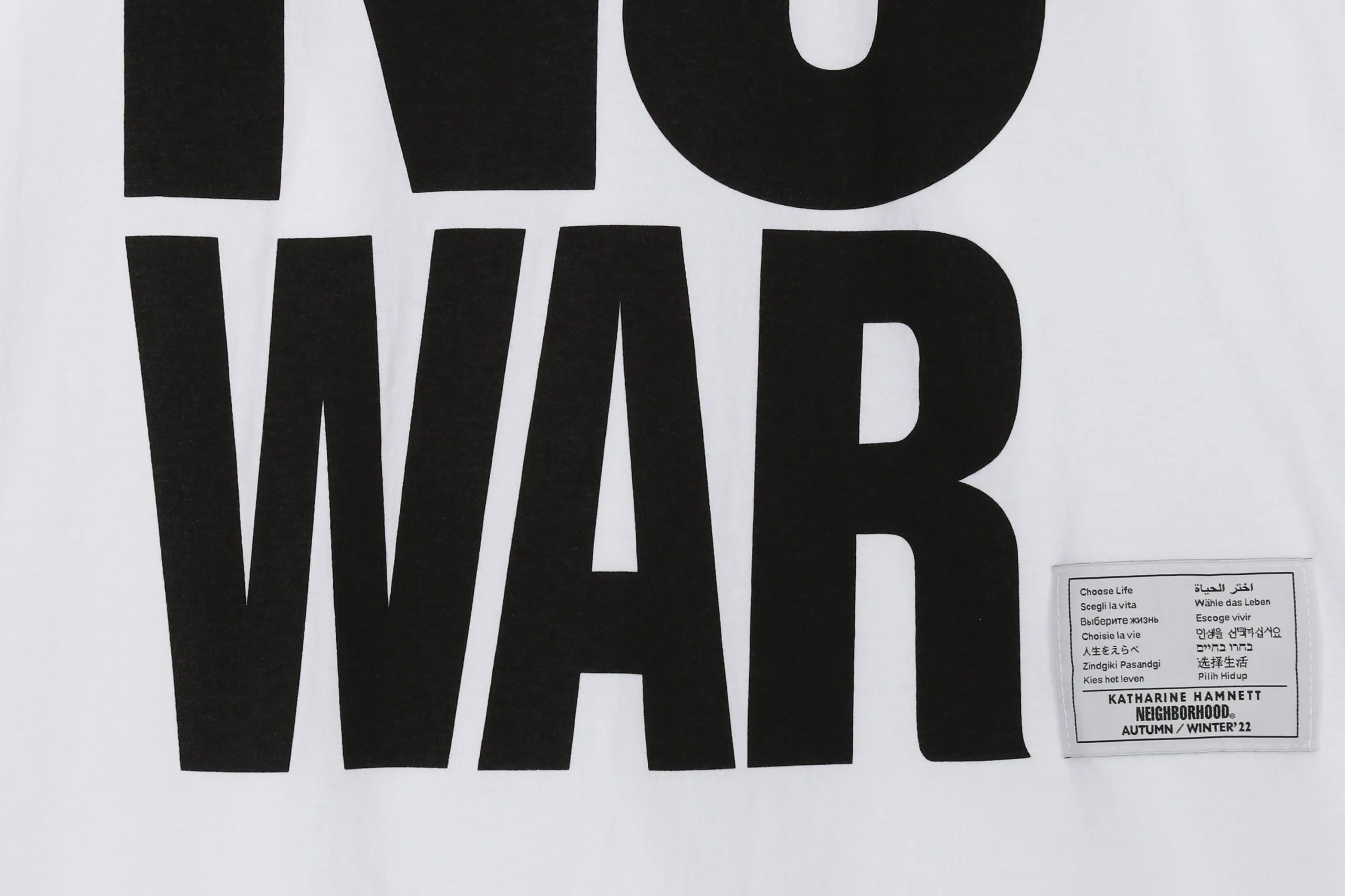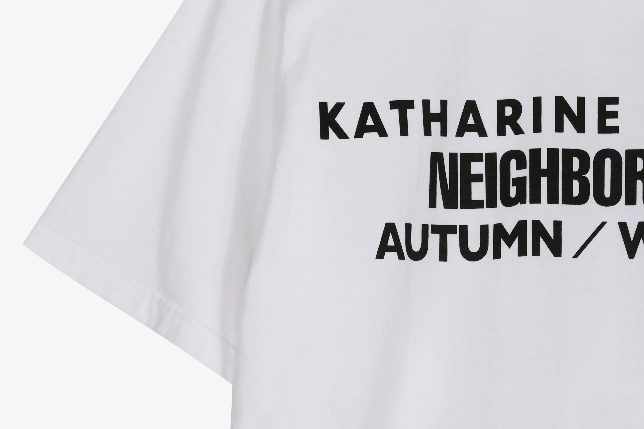 Neighborhood collaborates with Katharine Hamnett on a politically driven capsule that delivers messages from the core of 80s New Wave and various facets of club culture. The collection draws on Hamnett’s archival works, with her bold typographic works gaining critical acclaim in he fashion scene as well as wider pop culture. Rubber printed on a 100% cotton T-shirt with a special collaboration woven label.