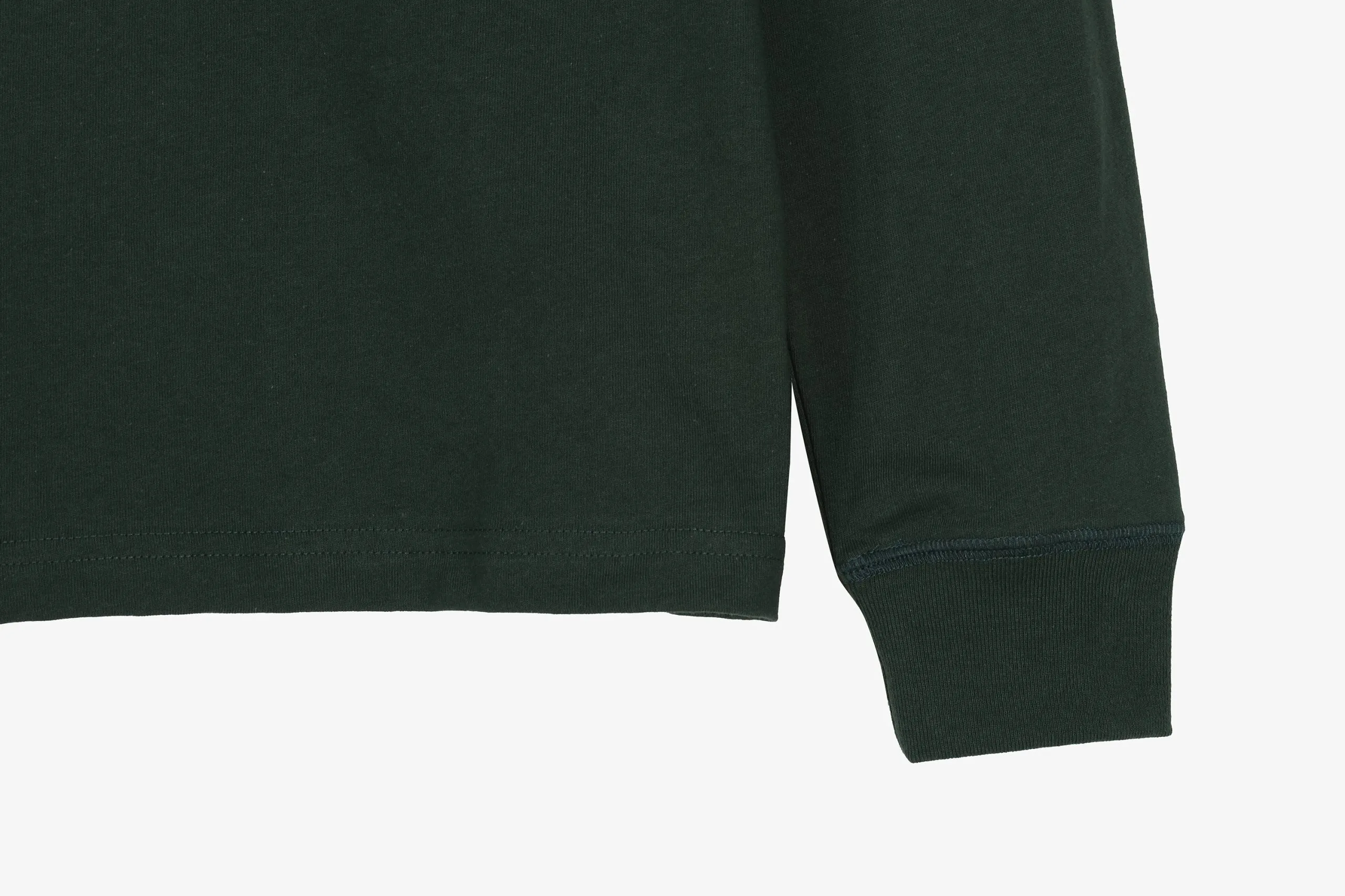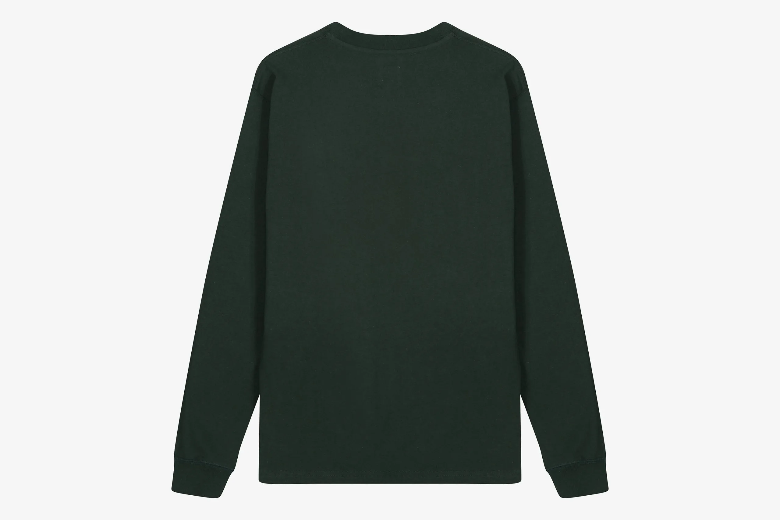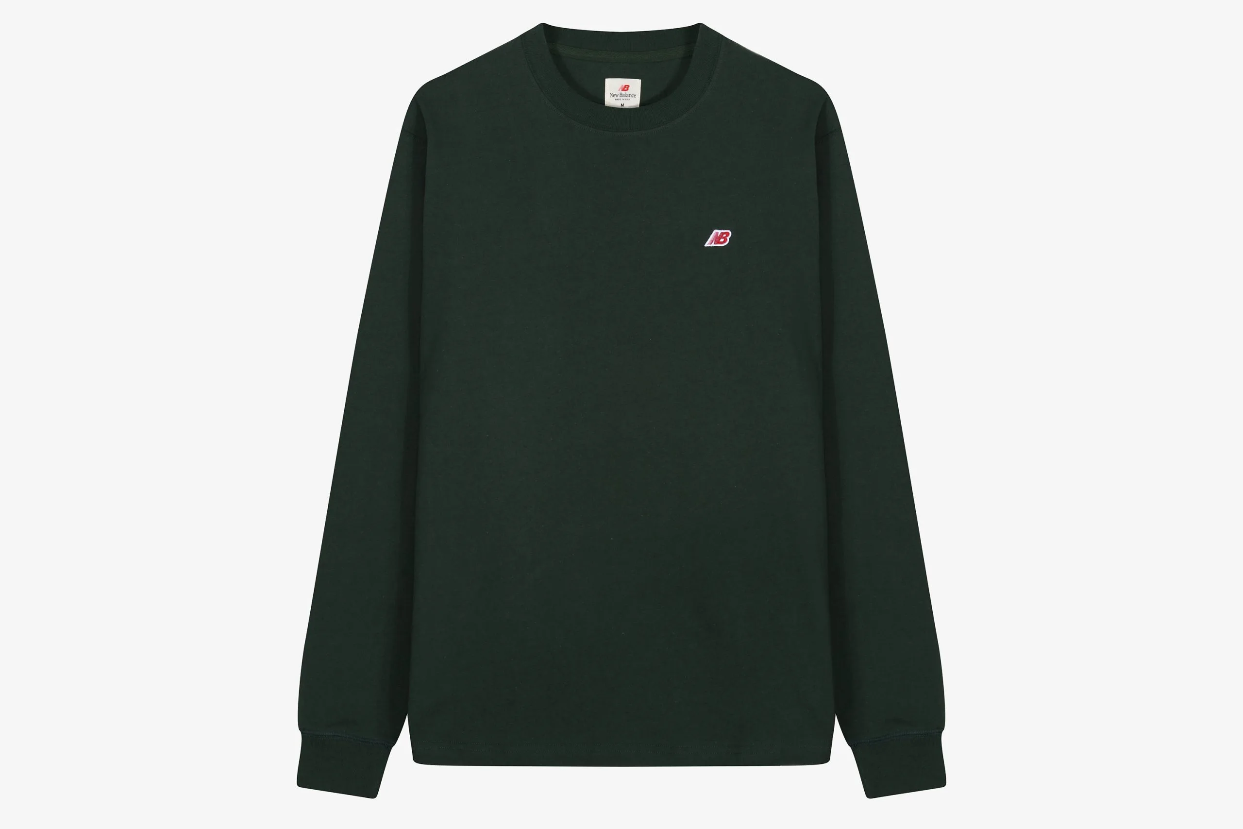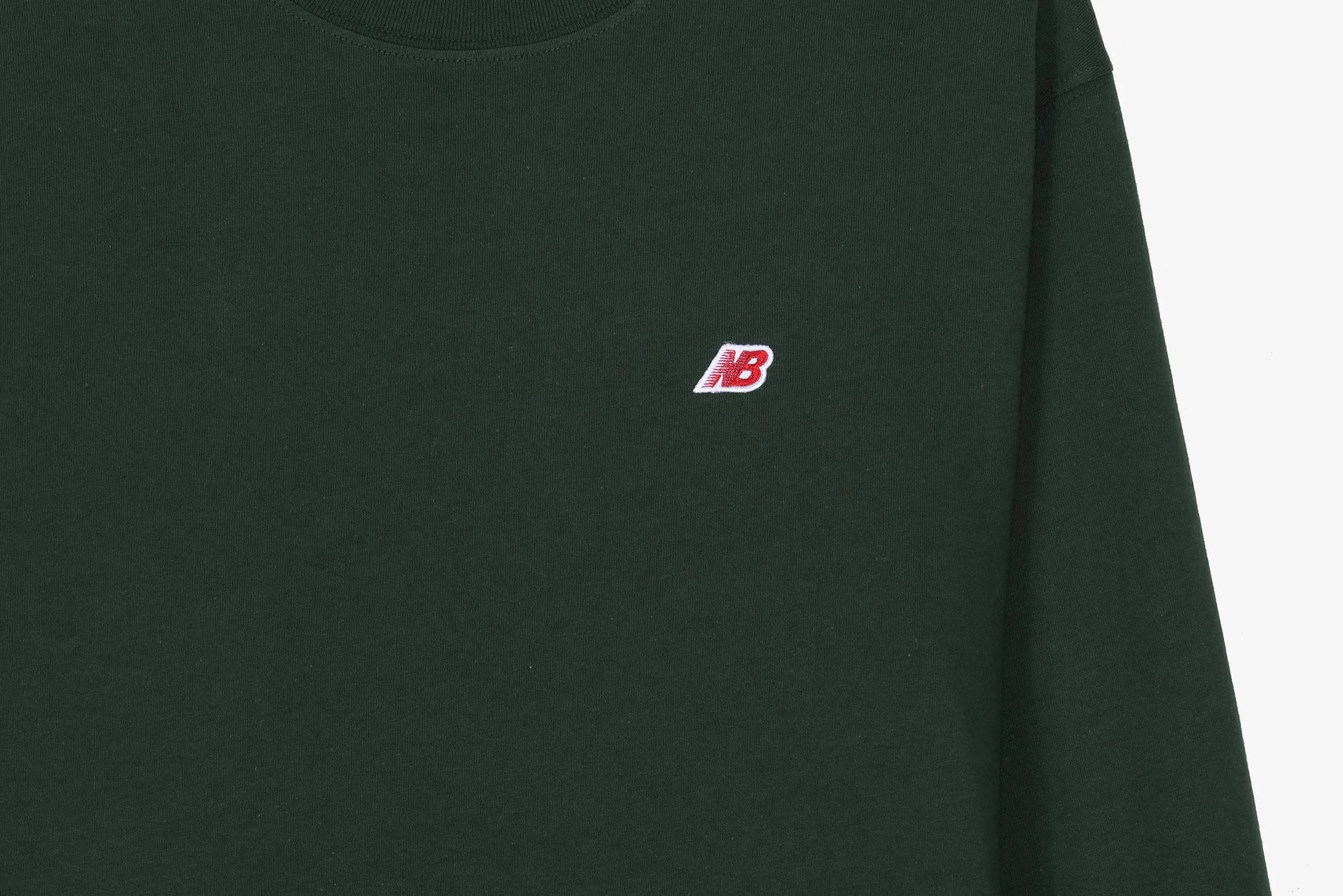 Here we have a uniform staple long-sleeve tee constructed from 100% cotton in the USA. A New Balance NB logo embroidered patch appears on the left-hand side of the chest.